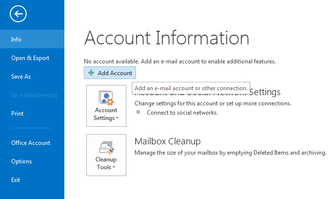 On the main window navigate to taskbar, click "File" and then click to "Info" tab. Click on button "Add Account".