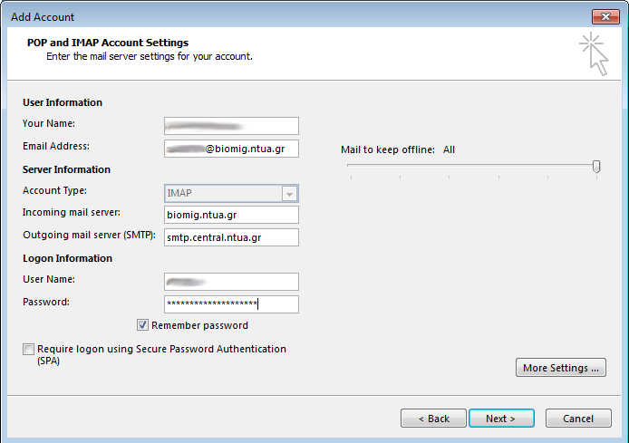 On the "Add Account" fill in your personal details and click on "More Settings" button. SMTP server must be smtp.central.ntua.gr due to restrictions with NTUA's relay server.