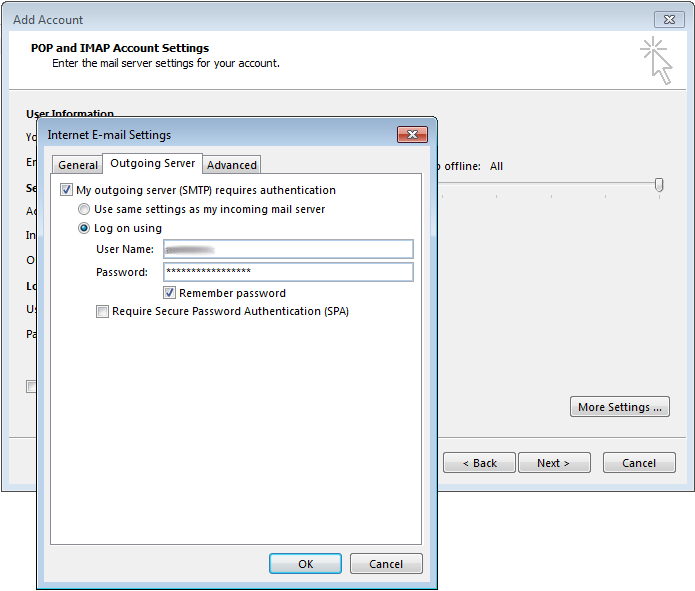 Navigate to "Outgoing Server" tab and click on option "My outgoing server (SMTP) requires authentication". Then select "Log on using" and fill in the username and password provided by NTUA's Central Network Administration.