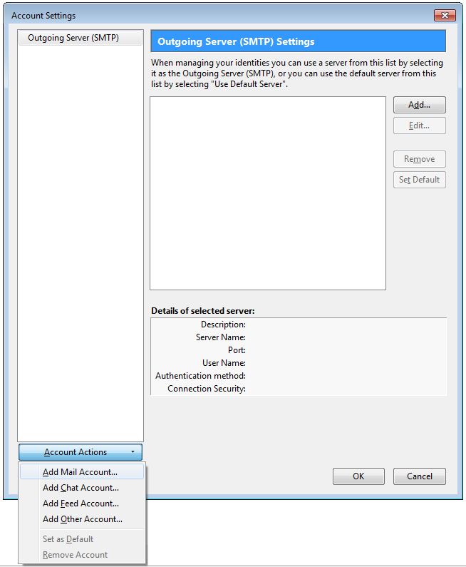 On the "Account Settings" window navigate to the bottom, click on "Account Actions" dropdown list and select "Add Mail Account".