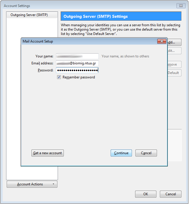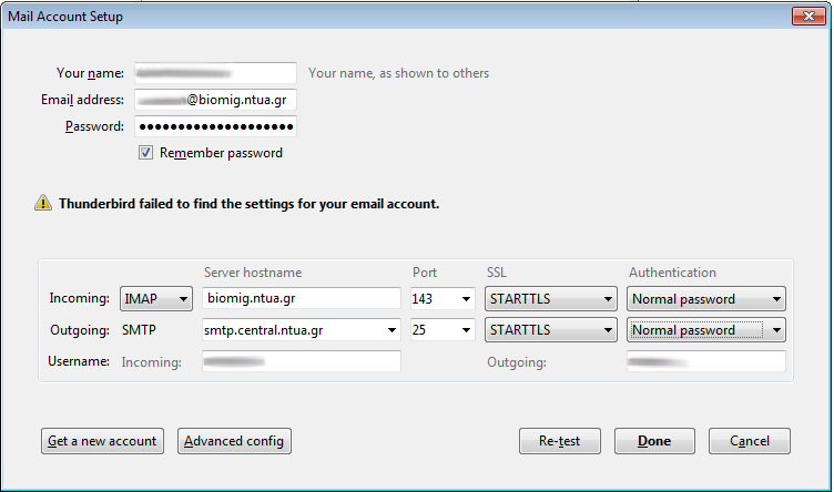 At this point Mozilla Thunderbird will try to locate BIOMIG's mail server. In case it fails, click on button "Advanced Config" and enter the following settings. Username for incomig and outgoing mail are those provided by BIOMIG. SMTP server must be smtp.central.ntua.gr due to restrictions with NTUA's relay server.